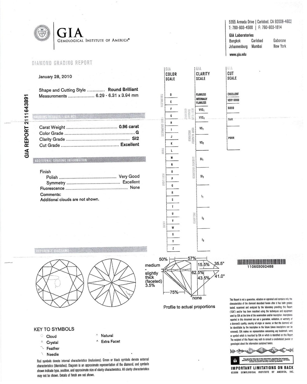 0.96 CT ROUND DIAMOND G/SI2 GIA#2111643891